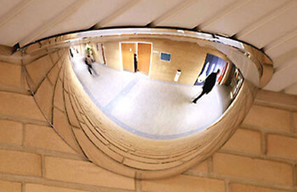 Ein Vollkuppelspiegel bietet einen 360° Winkel-Überblick und wird verwendet, wenn eine größere Perspektive benötigt wird. Der Spiegel ist gewölbt und kann mit den vier Befestigungsbohrungen im Flansch entweder an der Wand oder an der Decke montiert werden