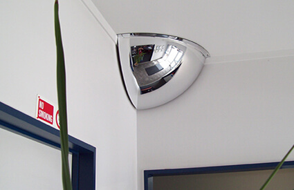 Der Viertelkuppelspiegel mit einem 90º Sichtfeld ist speziell für Ecken entwickelt worden und gibt einen guten Überblick über einen gesamten Raum. Eine viel gewählte Alternative für viele Industrien.