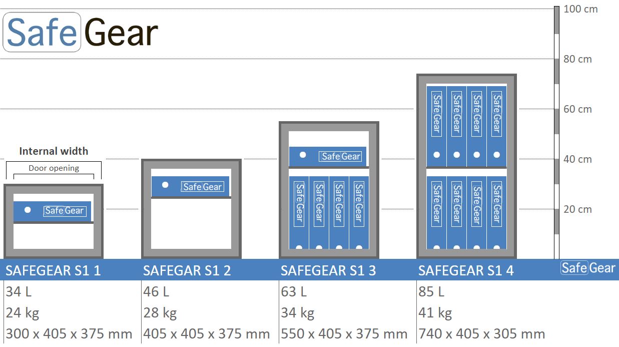Der SafeGear S1 ist erhältlich mit: - Doppelbart Hochsicherheitsschloss (65mm lang) und zwei Schlüsseln, oder - Elektronischem Hochsicherheitsschloss mit einem Manager-Code und einem Benutzer-Code Die Tür verfügt über einen silbernen Griff (12mm hervorstehend).
